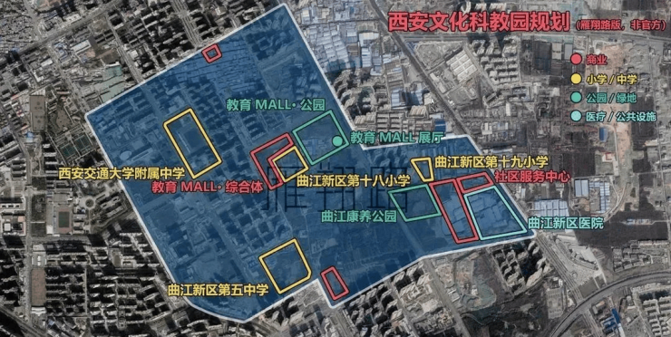 文明科教园:片区内规划有公园(文教园城市公园)、校园(曲江第三校园)、医疗康养(曲江新区医院)地铁五号线 、曲江构思谷等
